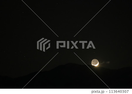 北杜市白州町から見る、茅ヶ岳の左側から昇る地球照の逆三日月