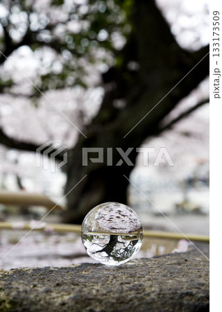 ガラス玉の中に満開の桜の花と水に浮かぶ散った花びらが映っています。