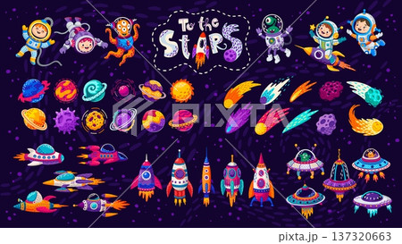 Cartoon kids astronauts with spaceships and rockets, galaxy shooting stars and space planets, vector icons. Kid astronaut or spaceman with asteroids and meteors, UFO saucer and funny alien characters