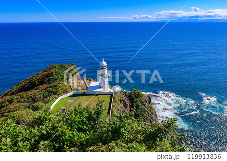 北海道/ 夏の朝陽に照らされるチキウ岬灯台(地球岬灯台・地球岬展望台)
