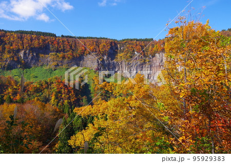 新潟県津南町にある見玉公園中津川渓谷展望台及びその周辺から見る柱状節理の岩石と紅葉の風景