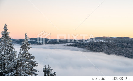 Winter inversion sunset with snow covered hills and forests rising above a sea of clouds, captured from above, with warm evening light painting the sky in glowing tones.