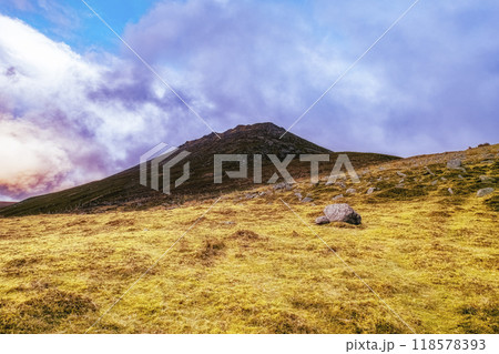 A grassy hillside slopes upward towards a mountain peak under a partly cloudy sky. Scattered rocks dot the foreground of the landscape.