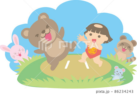 熊と相撲を取る金太郎_観戦する動物と背景あり