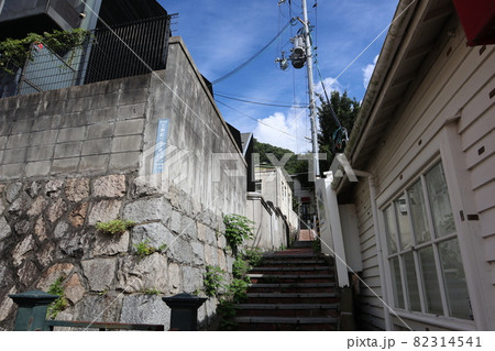 坂の上から見た塀に囲まれた坂道と緑の樹々と電柱と電線と家のある神戸北野の町の風景