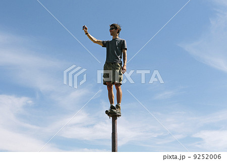 Man standing and balancing on a metal post, looking towards expansive sky, on Surprise Mountain, Alpine Lakes Wilderness, Mt. Baker-Snoqualmie national forest.
