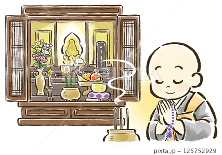 線香を焚き仏壇に向かって合掌する子どもの線香を焚き仏壇に向かって合掌する子どものお坊さん