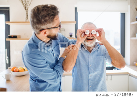 A portrait of adult hipster son and senior father indoors at home, having fun.