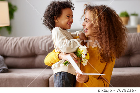 Young mixed race woman getting congratulations from son on Mothers day