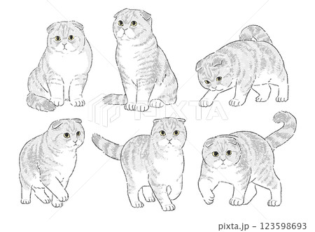 様々なポーズのスコティッシュフォールドの手書きイラストセット