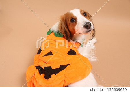ハロウィンの服を着て振り向きポーズのコーイケルホンディエ