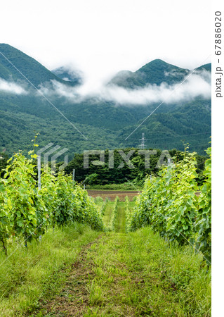 宮城 雨上がりのワイナリーの垣根式栽培ぶどう畑
