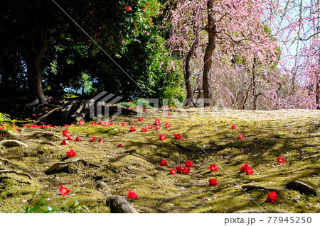 京都 城南宮 枝垂れ梅と椿の落花の競演