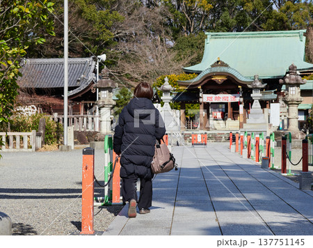 冬の昼の名古屋市の城山八幡宮に参拝する中年女性の姿