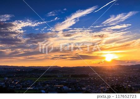 京都府最南端木津川市城山台城跡からの夕景 山麓を照らす夕日と夕焼け雲