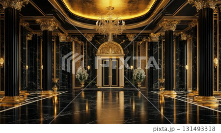 Elegant black palace hall with golden details and marble flooring