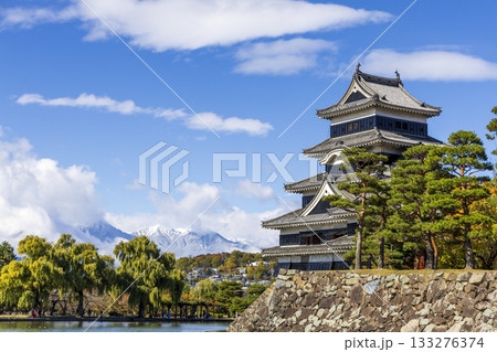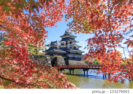 紅葉に囲まれた秋の松本城と美しい水辺の風景