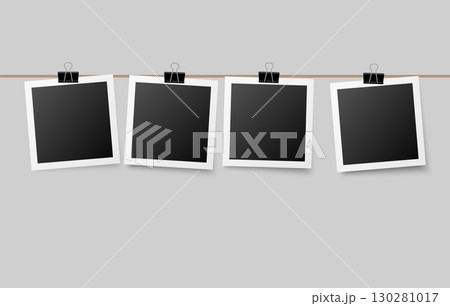 Photographs hanging on a string attached with office clips, cozy decorative concept perfect for personal memory boards, wall displays, or creative layouts.