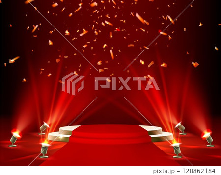 Stage with red carpet, confetti and spotlights
