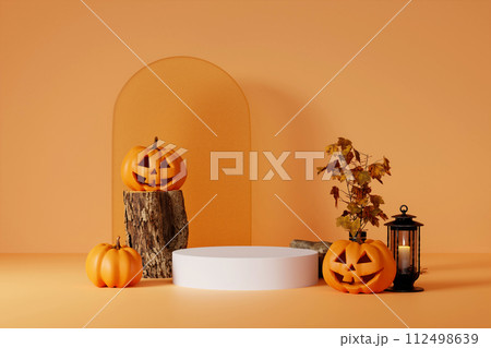 3D pedestal podium set on orange background. Halloween pumpkin with frame. pumpkin display showcase, product promotion. 3d render.