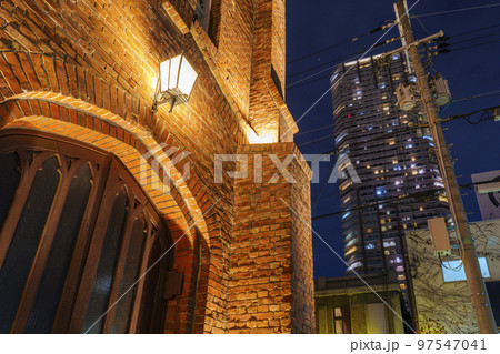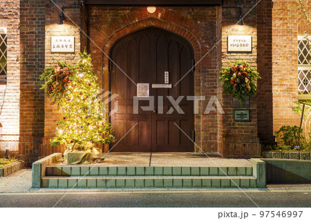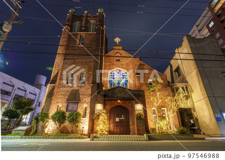 夜にライトアップされた川口基督教会の素敵な外観(クリスマスシーズン)