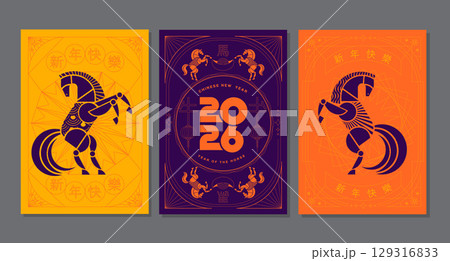 Chinese New Year Illustration ,Year of the Horse with Golden Rearing Horses and Traditional Lunar Elements