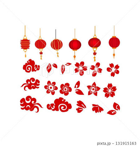 紅白の提灯 イラスト素材セット(水彩風ベクター)