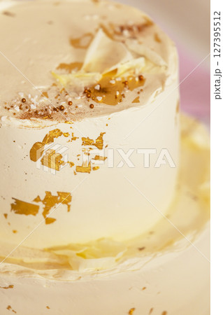 Delicious two tiered cake decorated with gold leaf and white chocolate shards