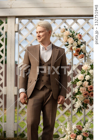 Groom in a stylish brown suit standing near a floral wedding backdrop