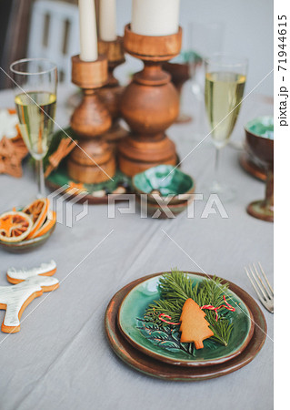 Table is served for a Christmas dinner in the living room, close-up view, table setting with a