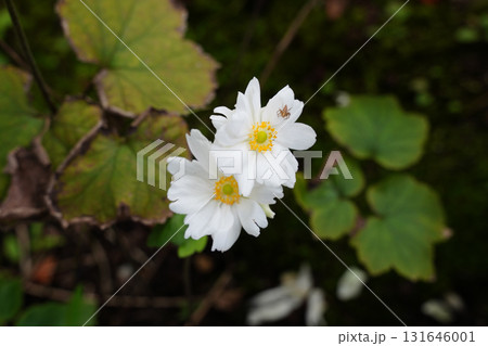 京都の寺院の庭に咲くシュウメイギクの白い花