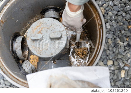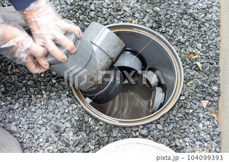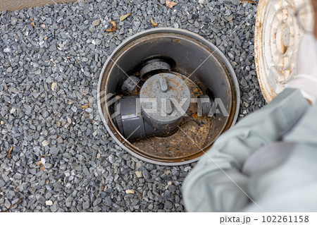 一戸建て住宅の外の汚水桝を掃除しているところ