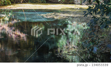 秋の終わりの水源、水面に映る木々と落ち葉