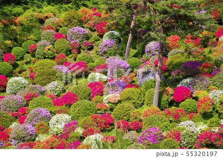 五月晴れの早朝に輝く塩船観音寺の満開のツツジ園 全景