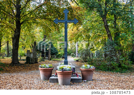 Autumn view of famous Old North Cemetery of Munich, Germany with historic gravestones.