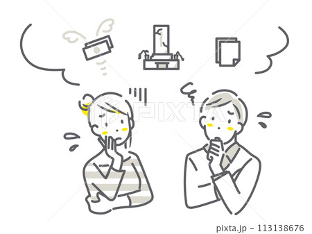 墓じまいを考える若い夫婦 シンプルでお洒落な線画イラスト