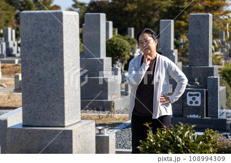 墓参りに来て考え込んでいる中高年女性