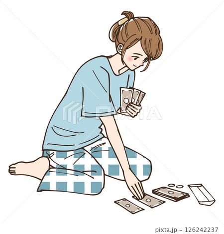 お金をどう使うか振り分けている女性