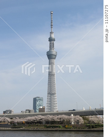 春の背景素材・墨堤の桜堤の向こうのスカイツリー・縦位置