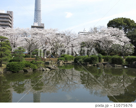 桜が咲く隅田公園(墨田区)の池に映る逆さの東京スカイツリー