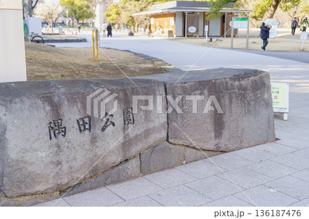 桜が咲く春の隅田公園(墨田区)と東京スカイツリー