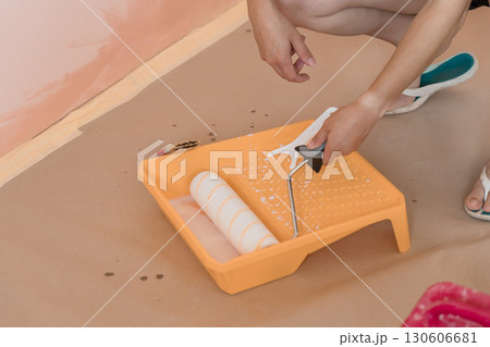 Interior Home Painting Process with Peach Wall Color, Paint Roller, Tray, and Hands Applying Finishing Touches.