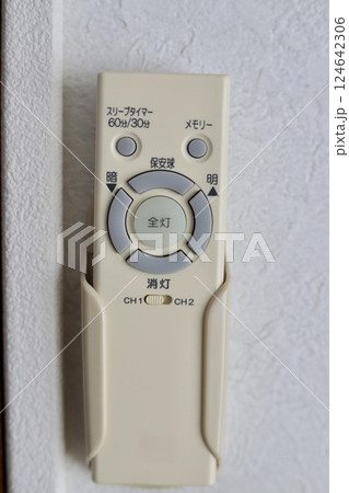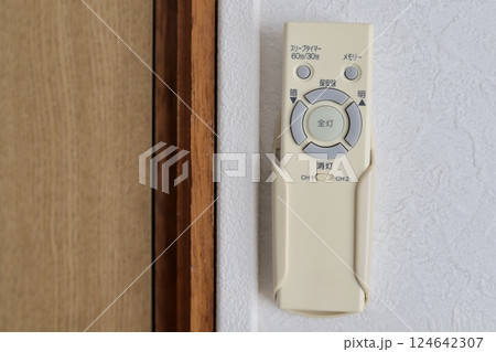 壁付されている少し黄ばんだ室内照明の古いリモコン