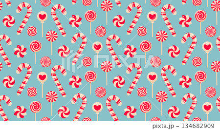 Seamless pattern featuring various red and white lollipops and candy canes on a soft pastel blue background.