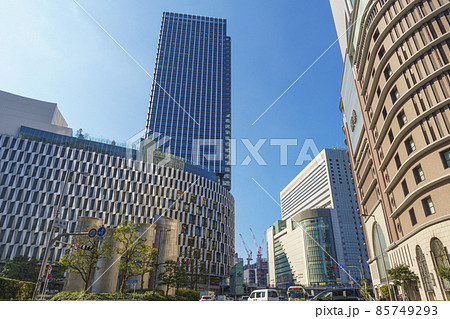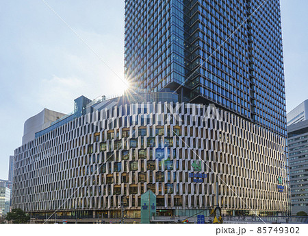 日本の東京都市景観 ビルの隙間から新宿副都心のモード学園コクーンタワーなどを望む