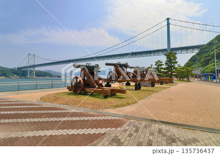下関市の壇之浦古戦場跡のみもすそ川公園から関門橋と砲台