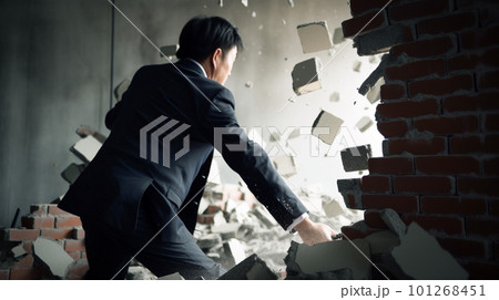 壁を壊すスーツ姿のビジネスマン