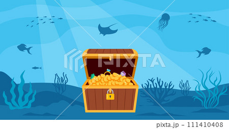 Underwater scenery with open pirate treasure chest on bottom. Vector illustration.