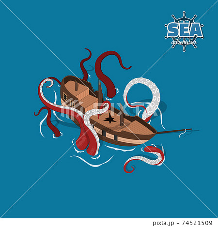 Big kraken octopus wreck the pirate ship vector background. Scary sea monster or giant kraken octopus animal cartoon character attacking corsair sailboat with huge tentacles. Pirate adventure game