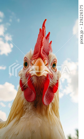 Close-up of a rooster with red comb against a blue sky, animal portrait against nature background